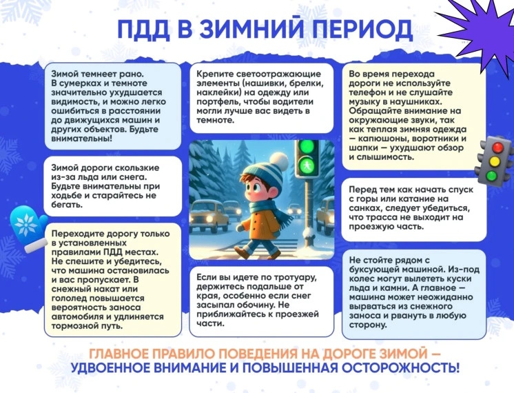 В нашей большой стране зима везде разная: где-то она тёплая, где-то морозная, где-то с пушистым снегом, где-то с ледяным настом, а в некоторых регионах снега нет вообще, или на несколько дней выпадет немного – вот так радость для детворы! Зимой происходит много природных явлений, которые влияют на нашу безопасность. Правила дорожного движения нужно соблюдать неукоснительно в любое время года, но зимой есть некоторые особенности, летом не столь заметные. Например, снегопад – это не только снеговики, горки и снежки, но и большие проблемы для всех участников дорожного движения! В снегопад ухудшается видимость. В это появляются заносы, ограничивается и затрудняется движение пешеходов и транспорта. Снег залепляет глаза пешеходам и мешает обзору дороги. Для водителя видимость на дороге тоже ухудшается. Снег налипает на лобовое стекло, а дворники не всегда справляются с массой осадков. Вот наши традиционные 10 правил для пешеходов: Правило 1. Рекомендуется всем пешеходам одеваться в одежду ярких цветов и обязательно носить световозвращатели. Правило 2. Переходить дорогу нужно только по пешеходному переходу и только на зелёный сигнал светофора. В теплой зимней одежде двигаться сложнее, и, если поскользнёшься, то можно потерять равновесие и упасть. Правило 3. Одежда с капюшоном ухудшает боковой обзор дороги и увеличивает время реакции на оценку дорожной ситуации. Правило 4. Будьте внимательны в местах остановки маршрутных транспортных средств, т.к. плохой обзор из-за сугробов. Правило 5. Обратите внимание на обувь: низкие температуры, гололёд, снегопад, скользкая обувь доставляют затруднение в движении. Правило 6. Детям и взрослым обязательно носить на одежде, ранцах, сумках световозвращатели (фликеры), т.к. наблюдается снижение видимости окружающей обстановки во время снегопада, сильных ветров, метелей. Правило 7. В гололедицу появляться перед близко идущим транспортом очень опасно: на скользкой дороге машину остановить трудно. Поэтому будьте особенно осторожны. Не спешите, т. к. можно неожиданно упасть и оказаться под колёсами. Правило 8. В солнечную погоду солнце, как ни странно, тоже помеха. Яркое солнце и белый снег создают эффект бликов, человека как бы «ослепляет». Поэтому нужно быть крайне внимательным. Правило 9. Если на ребёнке надеты варежки, лучше не просто крепко держать его за одетую в шерстяной домик руку, но и придерживать его за запястье. Правило 10. В оттепель под лужами скрывается лёд. Дорога становится очень скользкой! Поэтому при переходе через проезжую часть лучше подождать, пока не будет проезжающих машин. Ни в коем случае не бежать через проезжую часть, даже на переходе! Переходить только шагом и быть внимательным. Дорогие пешеходы будьте внимательны, соблюдайте правила дорожного движения. Берегите себя и своих близких!! С уважением отдел Госавтоинспекции МО МВД России "Слагородский".